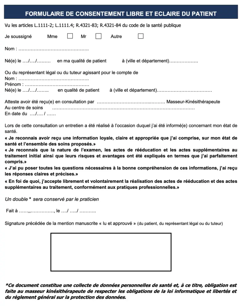 Formulaire de consentement éclairé du patient à faire lire, remplir et signer par le patient avant tout acte HN.