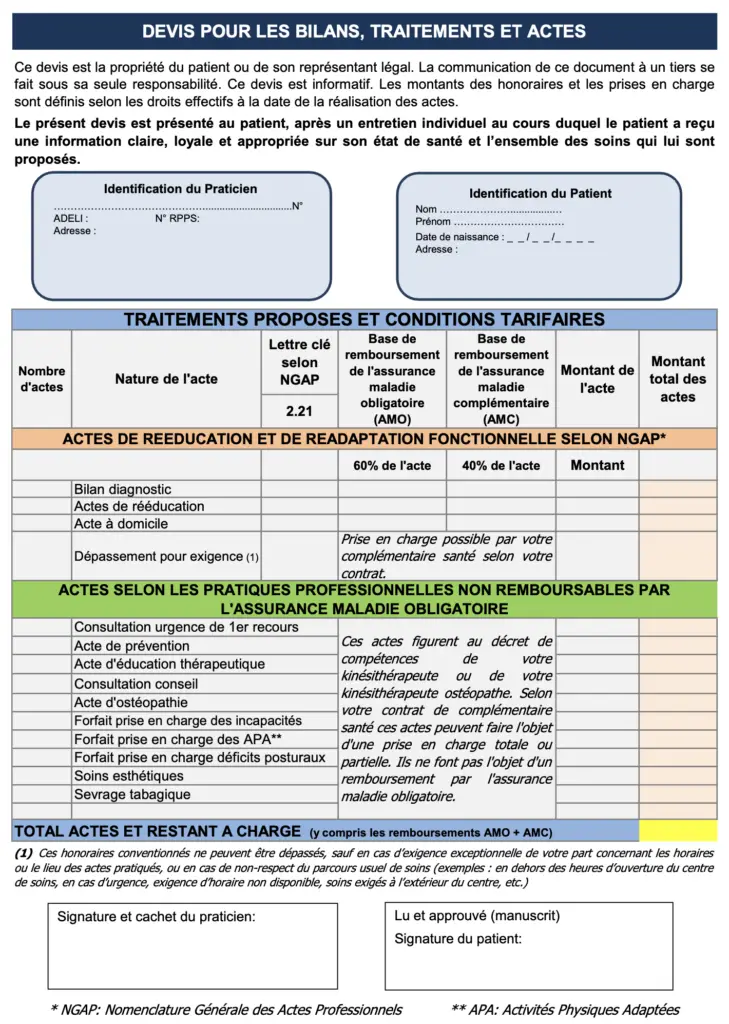 Devis et grille tarifaire pour les bilans, traitements et actes, à modifier selon vos crtières